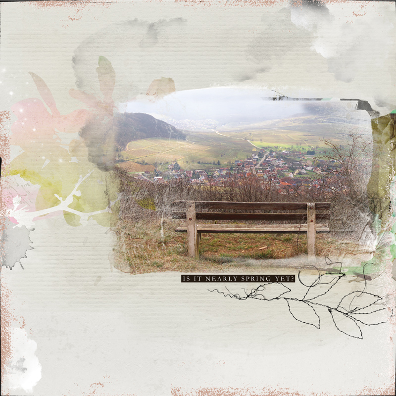 - Le jour suivant : il fallait utiliser les lettres du mot SMILE, chaque lettre représentant une composante de la page .. là encore il a fallu un peu de ruse : S = Spring, M = Mask, I = Ink, L = Leaves, E = Edges Overlay …… oui les langues, l’anglais, le français le plus souvent cela nous embête, et là je m’en suis servie astucieusement pour trouver les éléments du challenge !