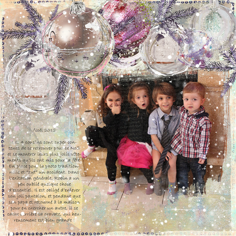 - Raconter une histoire insolite d’un soir de Noël, pas évident, je ne me rappelais pas vraiment un événement particulier. Bref j’ai scrappé les petits loulous, un soir de Noël ou Robin s’est retrouvé sans pantalon, caché derrière sa cravate, et son papa qui a dû repartir à la maison pour chercher un pantalon de rechange !
