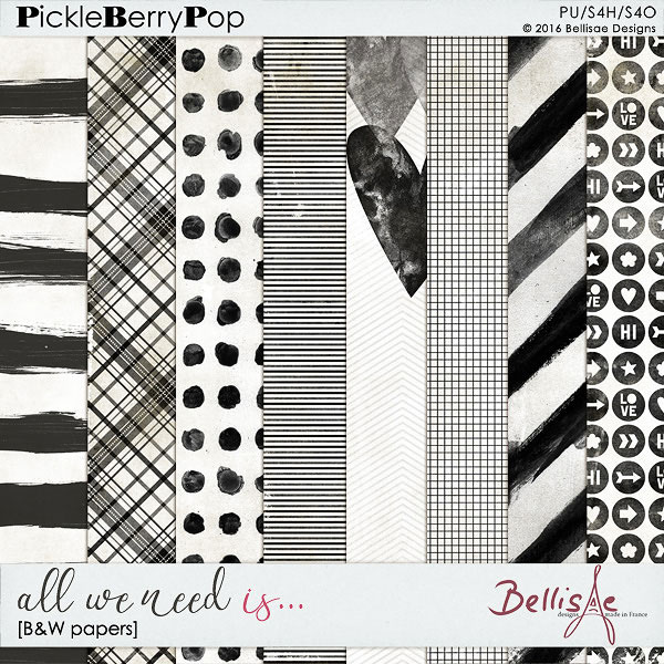 Le « February Pickle Barrel » est ouvert @ PBP etBellisae nous y présente sa toute nouvelle collection, ALL WE NEED IS… placée, vous l’aurez deviné, sous le signe de…..l’amour au sens large ! Elle vous permettra de scrapper toutes les photos de ceux qui sont chers à votre coeur ! Cette Collection est magnifique, et universelle …. j’aime particulièrement tous les papiers « B&W papers » pour scrapper des pages monochromes