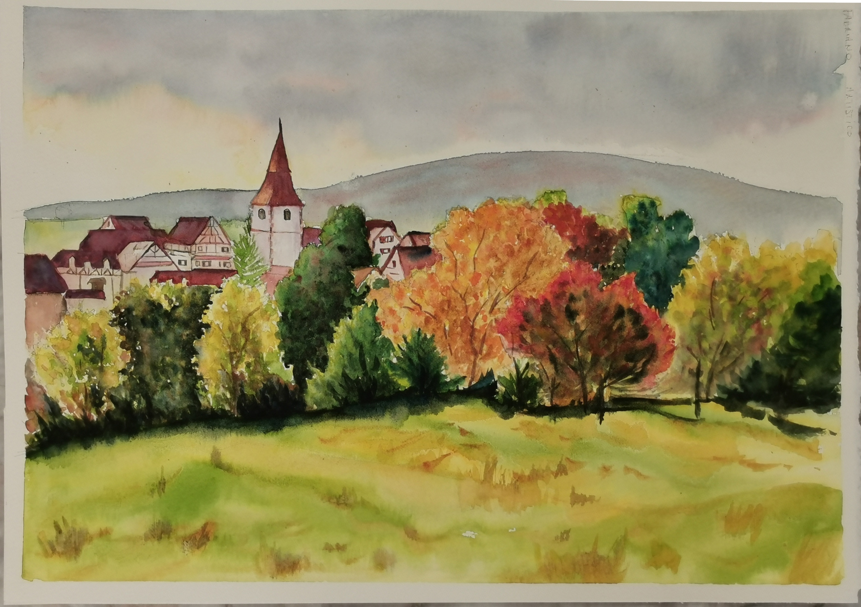 Envie de peindre les belles couleurs de l’automne ! C’est une photo sur postée dur Facebook d’un petit village d’Alsace qui m’a donné envie de faire cette aquarelle !