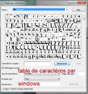 Il suffit de cliquer sur le symbole de Windows dans le bas à gauche, et dans le champ de saisie qui s’affiche taper : Table des caractères. S’ouvre alors un petit programme, où l’on peut afficher chacune des polices de caractères que vous avez installée sur votre PC et en regarder la table de caractère, c’est à dire tous les caractères qui la compose, les lettres, les lettres accentuées, les caractères spéciaux, et les très spéciaux, du genre de zigouigoui dont nous parlons.