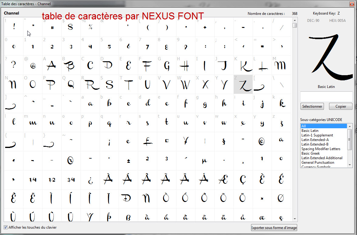 J’ai donc affiché ma police CHANNEL dans ce logiciel NexusFont : là aussi on a un outil « table de caractères » et MIRACLE ! les caractères s’affichent dans une grande fenêtre claire et lisible ! OUF ! Je cherche donc ce zigouigoui en question dans ce tableau de grandeur lisible cette fois et je le trouve effectivement, juste après le Z. ( image 3) dans le coin en haut à gauche est indiqué avec quelle touche du clavier on peut atteindre ce caractère spécial.