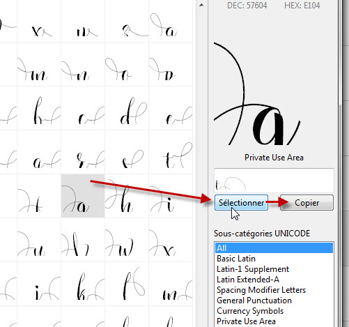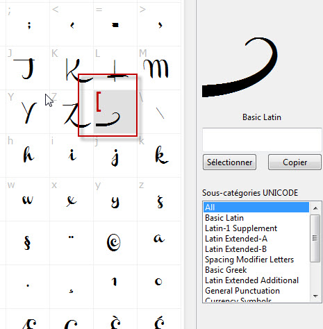 Mais en continuant à explorer, cliquer, chercher, voilà que je m’aperçois que dans NexusFont il y a un champ « sélectionner » et « copier » .. clic clic j’essaye et MIRACLE ça marche !