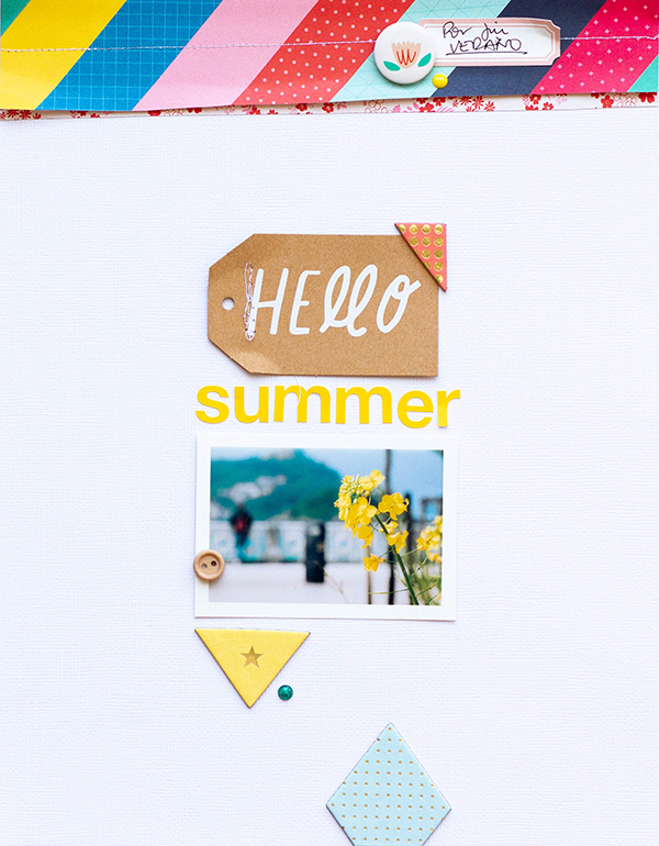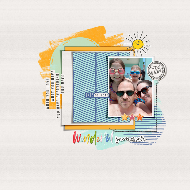 Comment ne pas être interpellée par la gaieté et la simplicité de cette page ? Les couleurs vives attirent le regard, mettent en valeur une petite photo toute simple, juste quelques mots et cela donne une page magnifique pour célébrer la chaleur de l’été !