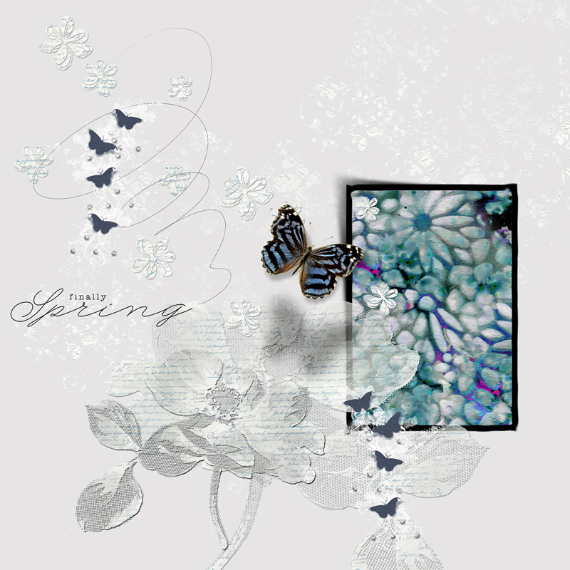 2. Les styles : J’ai simplement mis un calque avec un gris très clair pour le fond, j’y ai posé les grandes fleurs du bas « Springbreak ABP15 » et j’ai appliqué une style feuillage blanc de la collection Urban garden