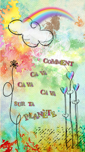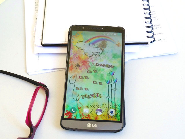 J’avais commencé par faire ceci. Cela me plaisait bien, c’est gai et coloré ! et reprends les paroles d’une chanson de Claudio Capéo qui me met de bonne humeur. Comme dit plus haut, il s’est avéré que cela n’était pas très pratique, cachant trop les icônes de mon téléphone. J’en ai donc refait d’autres …