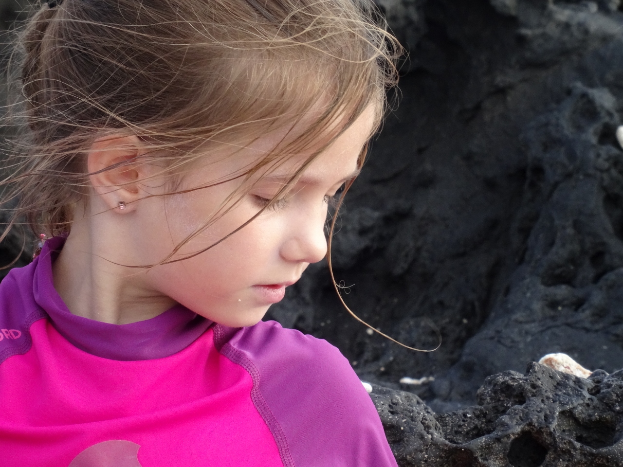 Une photo prise à l’Ile de la réunion d’où l’arrière plan en lave très noire, et le maillot de bain flashy de Mila. Malgré tout, il n’y a pas eu de travail trop trop difficile pour transformer cette photo. Un filtre sketch pour faire ressortir les contours du visage, la conversion en noir et blanc, des niveaux pour booster les traits noirs et pousser les blancs. Un peu de blending.