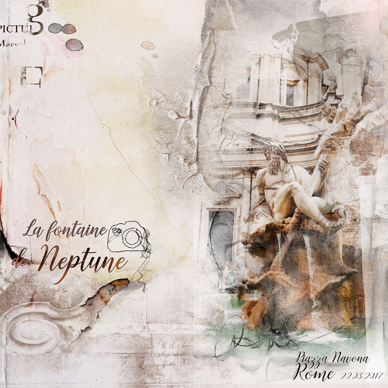 Pour le Anna Color Challenge de cette semaine, je commence à utiliser mes photos de mon séjour à Rome. Les couleurs correspondaient vraiment bien, et avec les palettes de Anna, il est vraiment facile de faire des pages correspondant à l’ambiance ancienne de Rome. Sur la place Navona, j’avais aimé toutes ces fontaines, notamment la fontaine de Neptune.