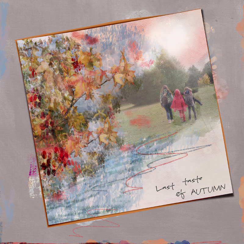Puis j’ai assemblé tous mes calques en une image composite, je l’ai légèrement inclinée, j’ai rajouté un des doodle border de la collection, en adaptant la couleur à ma page. J’ai rajouté une ombre -indispensable ombre, bien sûr- et quelques petites tâches de couleurs supplémentaires. …. Et voilà !