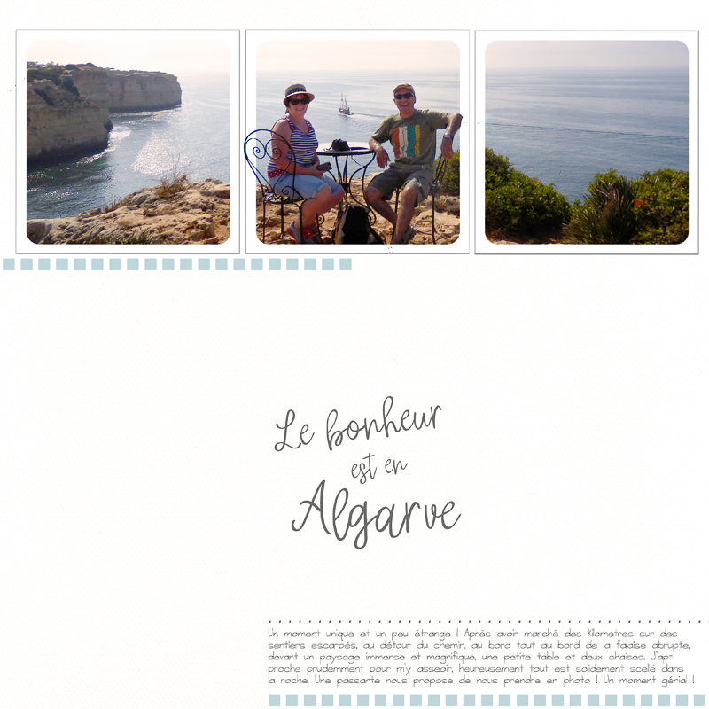 Nous étions en train de crapahuter sur le sentier de randonnée des « Sept Vallées suspendues » …. Une merveille ! Un sentier qui serpente le long des ces magnifiques falaises de l’Algarve, replonge vers des criques toutes plus belles les unes que les autres, et hop, cela remonte, on se retrouve perché très haut au dessus de l’océan, face à ces paysages immenses et si beaux ! Au milieu de toutes ces couleurs : de l’ocre, toutes les nuances de l’ocre … du bleu, du vert, de l’émeraude ! Et donc au détour du sentier, j’aperçois une mignonne petite table et deux chaises en fer. Au bord de la falaise ! Tout au bord ! Je m’approche prudemment, je me dis « vais-je oser m’asseoir ? » Car la falaise est vraiment haute, l’impression de vertige, le vent qui souffle ! et finalement je me rends compte que la table et les chaises sont solidement scellées dans la roche. OK ! no problem !