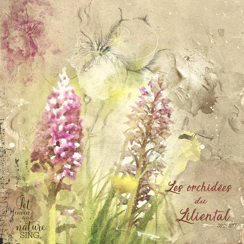 Pour le anna color challenge de cette semaine, des couleurs passées, un déclinaison de tons sépia. J’ai eu l’idée pour ma page en voyant un tuto sur le blog de Anna Aspnes, Watercolor Painting Effect Tutorial, J’ai utilisé les photos des orchidées du Liliental que nous avons faites la semaine dernière.