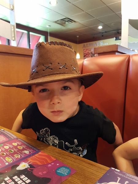 Et forcément, j’ai envie d’utiliser cette photo d’Elio, que je viens de recevoir, avec son grand chapeau texan, et son regard « méchant » !?