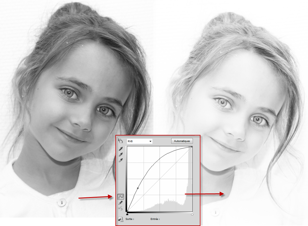 Nous allons maintenant « éclaircir » ce calque N&B avec les courbes : Image-réglage-courbes ou bien avec un calque de réglage : Calque-nouveau calque de réglage-courbes
