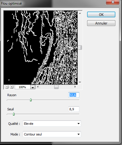 - Ensuite j’ai commencé à ajuster le rayon et le seuil, jusqu’à ce que les traits de contours qui apparaissent dans la miniature me conviennent …