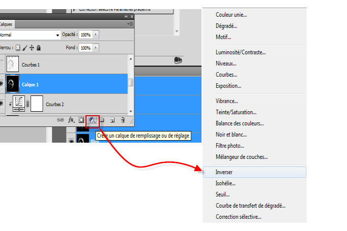 - On ajoute un calque de réglage (par la petite touche en bas de la fenêtre des calques) et on choisit « Inverser »