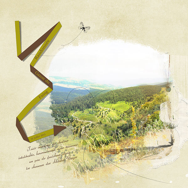 Cette page dans le cadre du challenge PUB du Forum Publiscrap : l’idée était de fabriquer la bande de papier pliée pour la flèche …