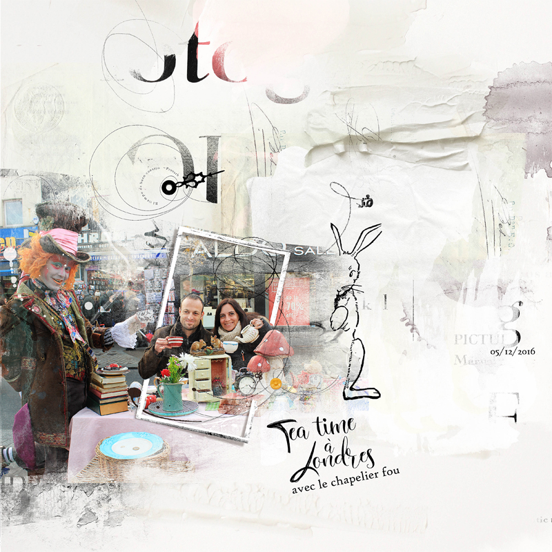 Les kits d’Anna se prêtent admirablement à ce genre de page. Du flou, de l’artistique, des overlays, et un petit tampon lapin qui vient compléter la magie et nous emmène dans le monde d’Alice au Pays des merveilles.