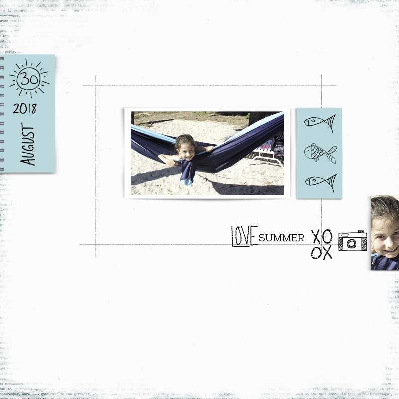 Il ne faut pas grand chose pour personnaliser et faire une page unique ! Il suffit de trouver quelque chose qui accroche le regard ! Et là, c’est tout simplement le focus sur la petite découpe de photo sur la droite, toute petite, mais centrée sur le charmant sourire de Mila !