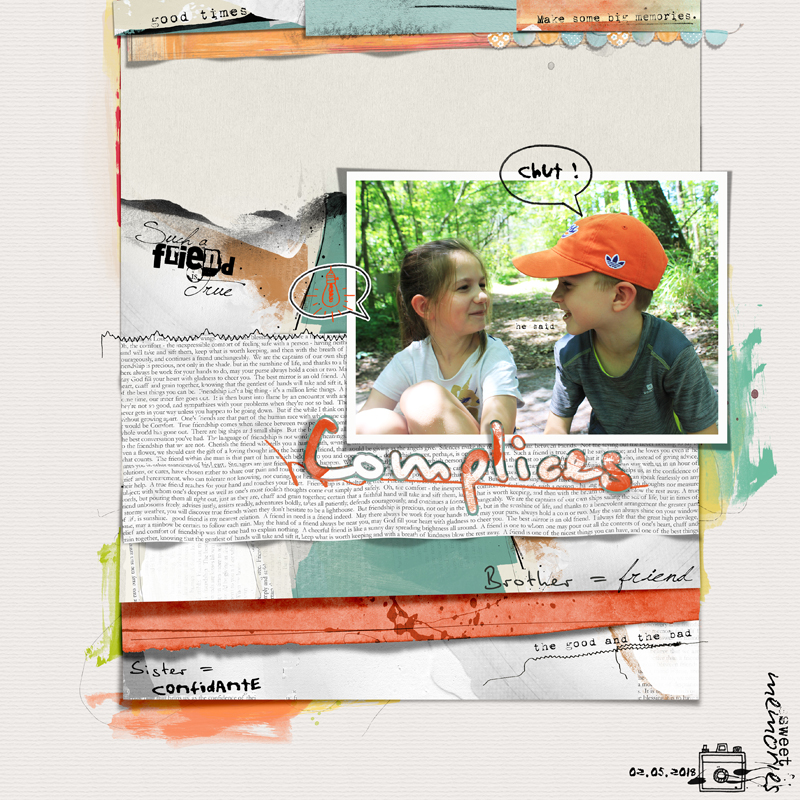 J’aime beaucoup faire ce genre de page, où il y a plein de choses à voir ! on ne voit pas tout à la première lecture de la page, il faut s’y pencher, observer, pour en découvrir tous les secrets. J’étais bien inspirée par cette photo, en apparence toute simple, mais qui reflète si bien la bonne entente et la complicité de Mila et Elio, la soeur et son petit frère ! Tout est dans leurs regards, amusés, complices, et malicieux !