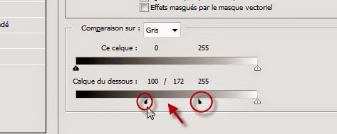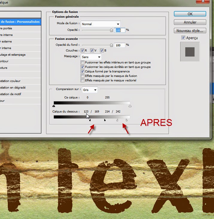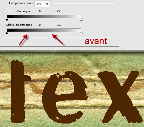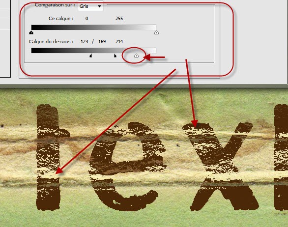 Puisque j’ai sélectionné le calque de texte dans la palette de calque et que le fond (le papier froissé) est sur le calque au-dessous , je vais déplacer les curseurs de « Comparaison » – « Calque du dessous » :